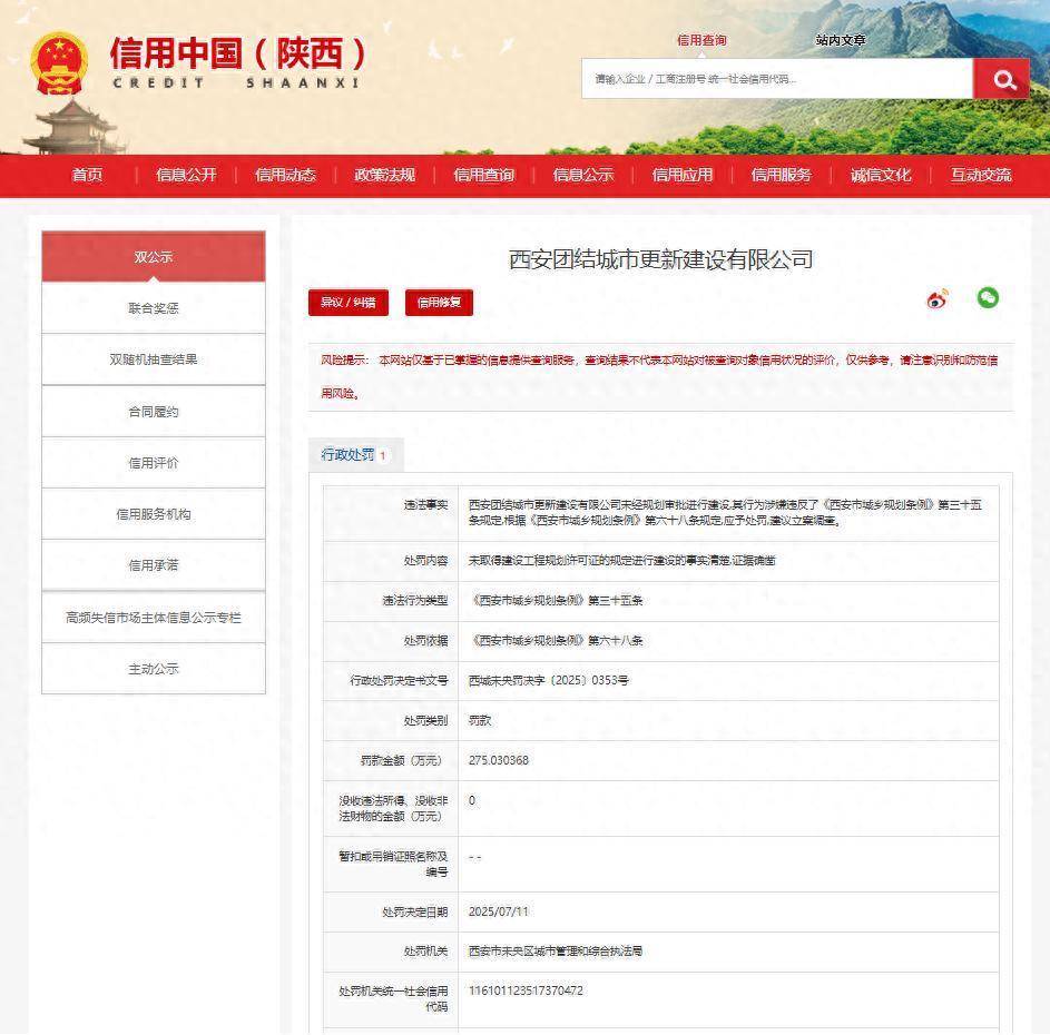 近日,齐鲁晚报·齐鲁壹点记者从信用中国(陕西)获悉泽巨配资,西安团结城市更新建设有限公司未经规划审批进行建设,其行为涉嫌违反了《西安市城乡规划条例》第三十五条规定,根据《西安市城乡规划条例》第六十八条规定,罚款275万余元。