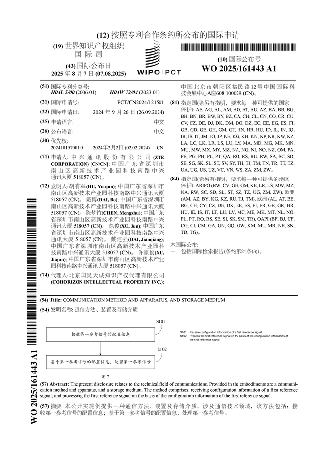 证券之星消息牛来乐,根据企查查数据显示中兴通讯(000063)公布了一项国际专利申请,专利名为“通信方法、装置及存储介质”,专利申请号为PCT/CN2024/121501,国际公布日为2025年8月7日。